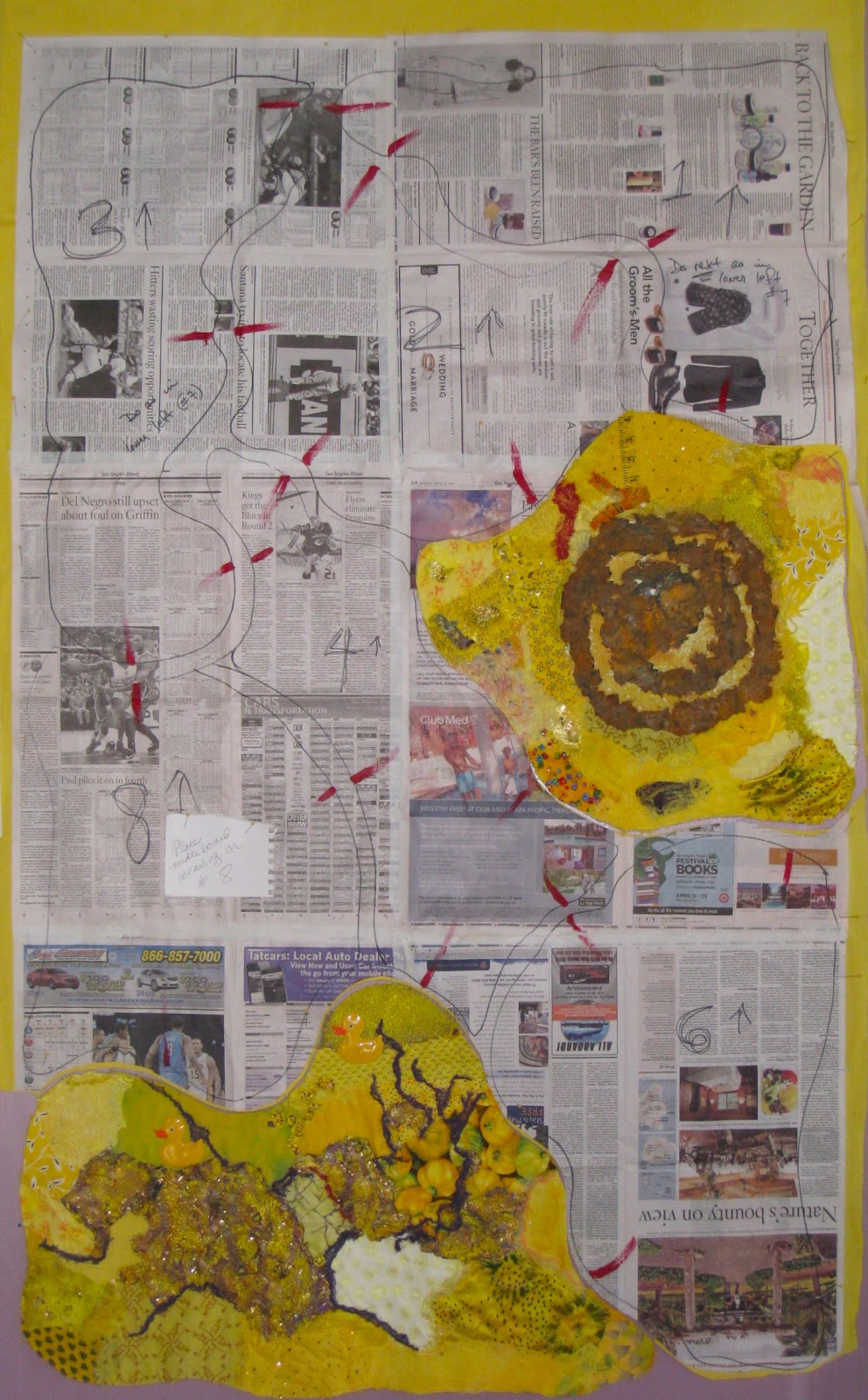 I've been working on the first three modules two of which are more or less done and pinned up. You can see the outlines of the rest of them. I have a really strong connecting device in mind which will tie them all together. That BIG REVEAL will not happen until the last of the eight units is done. Remember to click on any photo you'd like to see in detail.