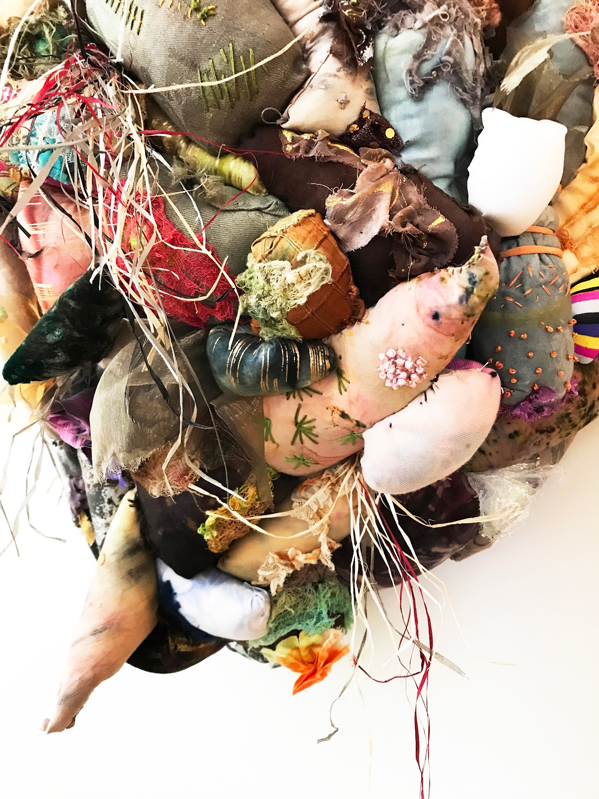Helmut is one in the on-going series of PENDULES. Bound and wrapped. About 26" long. Cording inside and LOTS of dyed cottons and other random fabrics. It was created over an old bicycle helmet as an armature which is no longer required as the piece holds its shape without it now that it is completed.